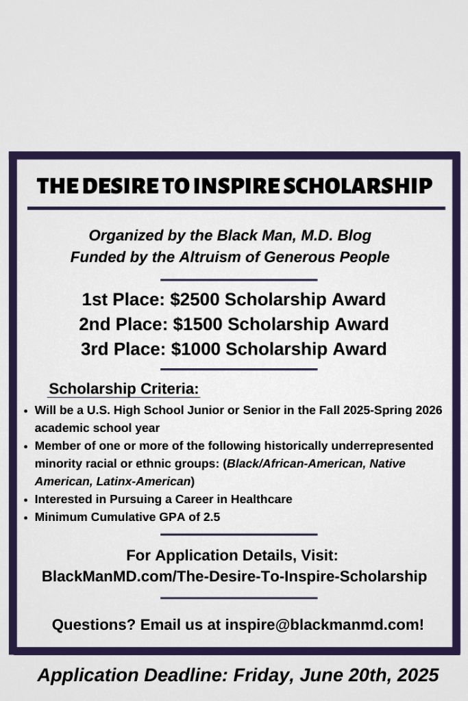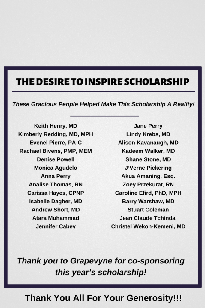 The 2025 Desire To Inspire Scholarship is a one-time financial award of $5000 (1st place – $2500, 2nd place – $1500, 3rd place – $1000) that is dedicated to recognizing young individuals from historically underrepresented minority groups who are interested in a career in healthcare and are making a determined effort to inspire others in some way, shape or form. The award can be used for educational purposes which will help the recipients reach their goals and their full potential while continuing to inspire others!